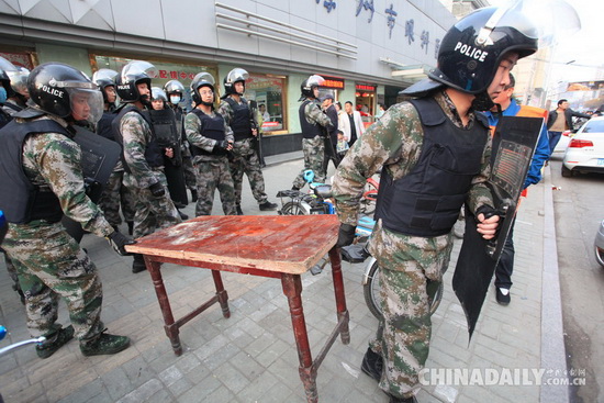 百余名全副武装的城管队员来到市中心富国街上,对前一段时间阻挠城管人员正常执法的一些顽固占道经营摊点进行整治。
