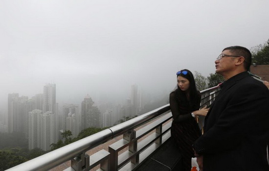 大陆游客从香港的大厦上远眺。