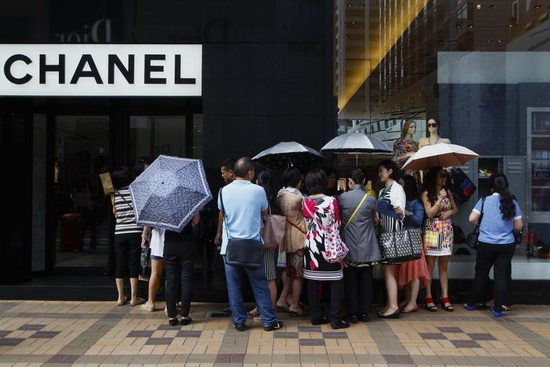 中国大陆游客在香港香奈儿店门口排起长队。中国游客涌入香港购物,为提振当地经济做出了巨大贡献。