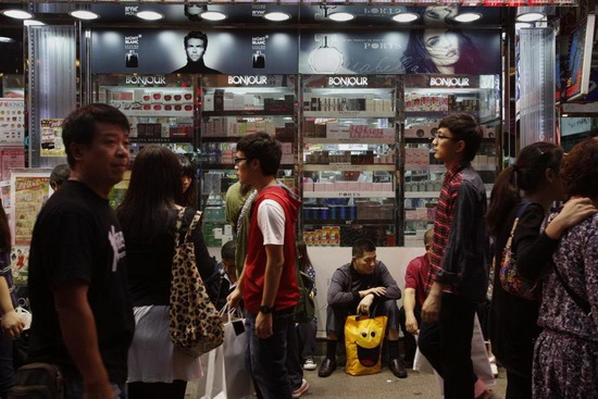 大陆游客光顾香港一处化妆品店。当地居民时常抱怨大陆游客提高了商品价格。