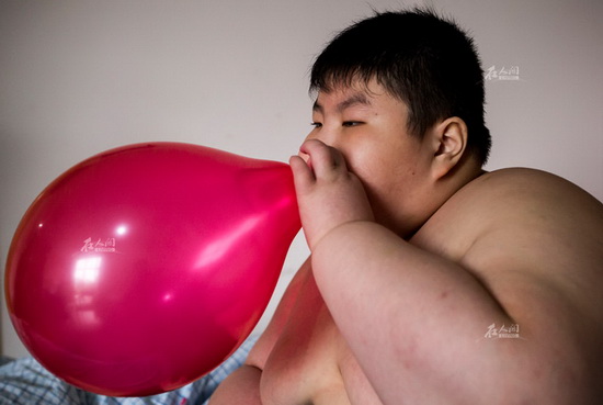 除了游泳,吹气球也是小胖每天的“必修课”。小胖每天要吹几十次气球,吹气球能锻炼他的肺活量。重度肥胖的人很多都患有睡眠呼吸暂停综合症,睡觉时很可能因呼吸暂停而窒息死亡。