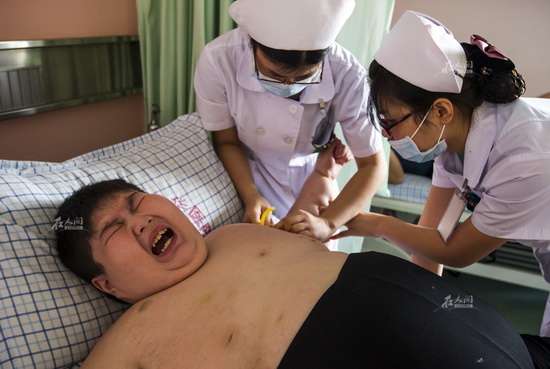 小胖的治疗并非一直这么顺利。7月27日上午,为了检查,小胖需要抽血。“好痛,我不要抽血!”由于抽血前不能吃早餐,饥饿的小胖心情很不好,不肯配合。