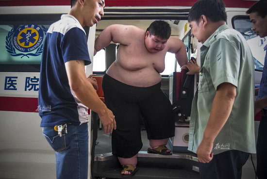 徐周磊,14岁,身高146厘米,体重300斤。这样的身形,不仅让他得到一个“小胖”的绰号,也改变了他的生活轨迹。本该在学校接受适龄教育的他,因为肥胖,跟着父亲到全国四处求医减肥,但每次都因为无法控制食欲,而“屡战屡败”。图为小胖小心翼翼地走下救护车。很多对于平常人来说很简单的动作,小胖做起来都极其艰辛。