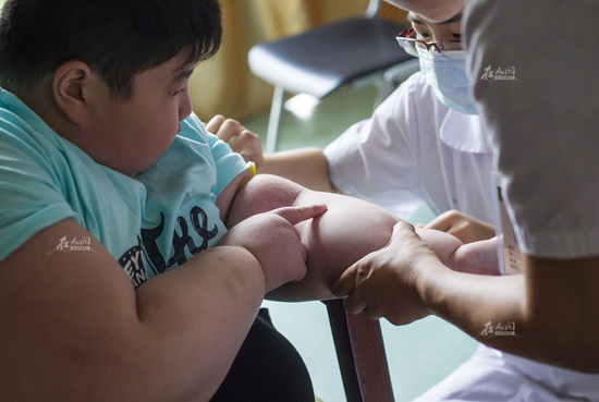 “这里!血管在这里呢!”小胖指着自己的手臂提醒护士。由于皮下脂肪太多,小胖的血管十分难找。最终,在爸爸逼于无奈的怒火之下,小胖才识趣配合。