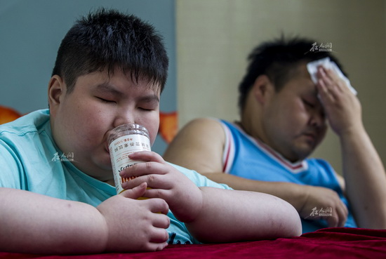 今年4月,小胖打电话找到广州一家医院的陈医生。他在电话里说道:“姐姐救救我,我不想像前段时间死去的那个哥哥一样,肥到天堂去了。你们能救我吗?”后来,他住进了这家医院接受治疗。图为小胖在医院发布会上突然就睡着了,手上拿着的瓶子是他从一名记者手上抢过来的。