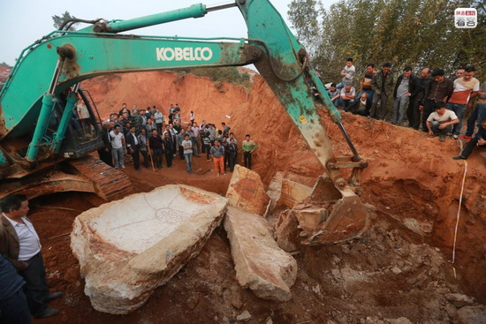 2014年10月14日,湖南省娄底市,一处新建城市建设道路施工现场发现一座古墓,现场用挖掘机的古墓进行挖掘。郭国权/CFP