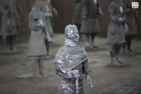 数据显示,中国有1500万件需要修复的文物,而专业的文物修复人才只有2000余位。图为2015年2月23日,陕西省秦始皇帝陵博物院兵马俑一号坑,一些修复中的兵马俑被工作人员用保鲜膜覆盖着不同部位。赵华/CFP