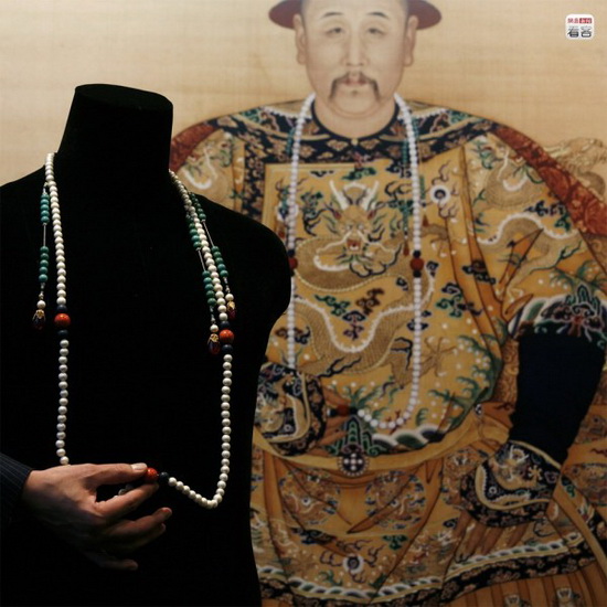 另据联合国教科文组织统计,流失到中国境外的中国文物大约有164万件,分散在全世界47家博物馆,而民间藏中国文物是馆藏数量的10倍之多。图为2010年3月9日,香港,清朝雍正皇帝上朝所戴的珍珠项链在苏富比拍卖行进行拍卖前的展览。REUTERS/Bobby Yip