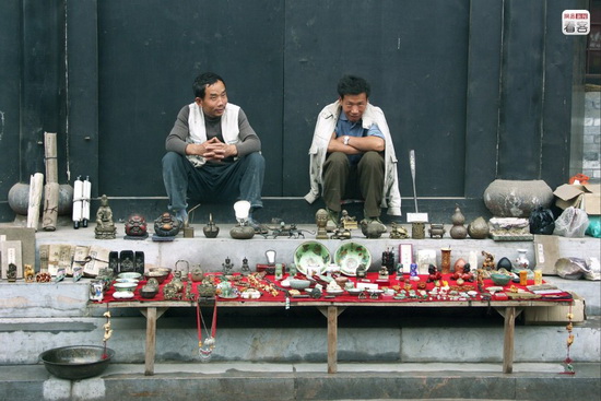 文物买卖一本万利,20世纪8、90年代,随着经济热潮掀起,文物走私一度猖獗。据海关数据,1997年仅海关旅检即查获文物走私案600多起,缉获文物1.12万余件。图为2006年7月24日,山西平遥,两个文物商人在等顾客上门。MyLoupe/UIG Via Getty Images