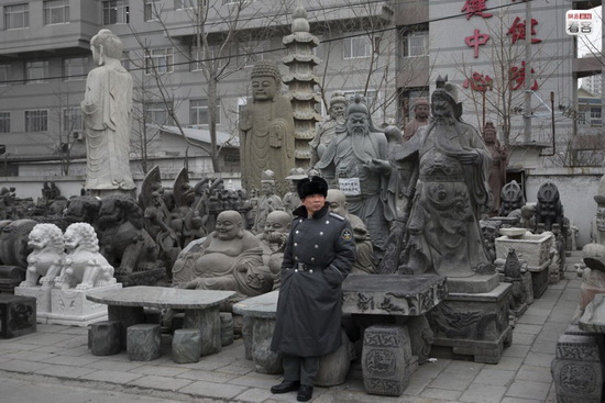 缺乏监管的文物市场成为被盗文物销赃的重要平台。图为2013年1月19日,北京潘家园旧货市场,一个保安站在大堆的雕像前。北京潘家园旧货市场以买卖古董文物闻名,这里既有真货也有假货。在周末的潘家园旧货市场,成千上万的来自国内和国外的寻宝者在这里搜索文物。 REUTERS/Stringer