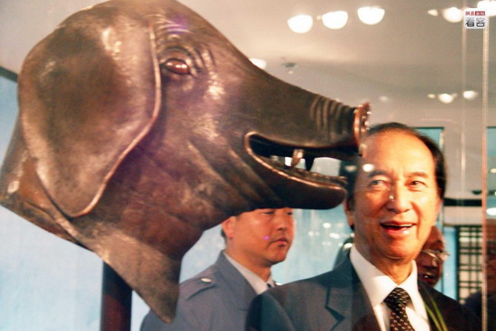 但事实上,依法讨还文物存在很大困难和国际争议,靠讨还回流的海外文物微乎其微。图为2004年4月30日,上海,“澳门赌王”何鸿燊在圆明园12生肖猪首铜像前。何鸿燊此前用600多万元买下了这只猪首铜像并捐赠给了中国的博物馆。晓阳/CFP