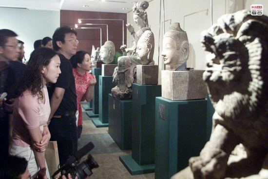 相当一部分文物在最近20年左右的时间里通过境外走私流到境外。据美国《商业周刊》2014年报道,作为文明古国的中国,每年有包括翡翠、瓷质花瓶和名人古画在内,价值百万美元的古董,被投机分子以低价报关等手段带出中国。图为2003年7月5日,北京,名为“中华遗珍重现北京”的展览开幕,16件曾流失海外多年的国宝级文物进行展览。李楠/CFP