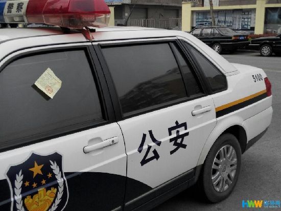 2015年3月29日,南京下关白云亭路上,违章停放的警车上的违章停放告知单。