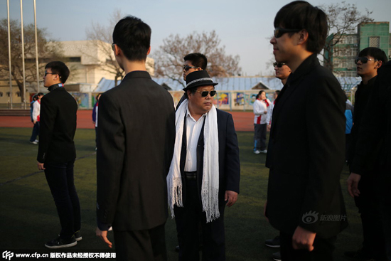 2015年4月3日,青岛十七中高二的学生和班主任在操场上进行“秀秀我的班主任”活动,十几名班主任把自己cos成了各种角色,有的扮演唐僧,有的扮演皇上,有的扮演美国队长,还有的干脆扮起了黑社会的老大,一帮学生“小弟”前呼后拥,甚是威风。