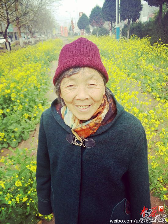 4月4日,网友“牦歌”在微博上晒出了一组照片,题为“你的皱纹比岁月更美”,照片的主角是“我奶奶”。一片金黄的油菜花田中,一位身穿灰色大衣,头戴枣红色线帽的老人或转身回眸浅笑,或低头轻闻花香,还45°角仰望天空,甚至单脚站立摆出“大”字状。最可爱的要数老人撷取了一支油菜花插在耳边,如果不是面庞已布满皱纹,老人就如同一个娇羞的小姑娘。