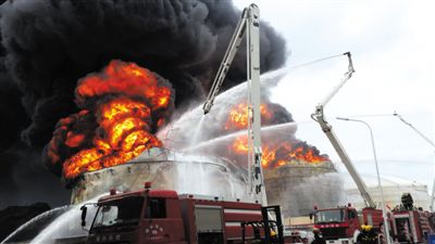 昨日,消防官兵在事发现场救援。此前,3个储油罐经历了数轮扑灭、复燃的情况。昨日上午,第4个储油罐爆燃着火。新华社发