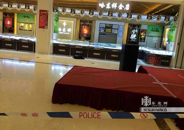 今晨3时20分许,哈尔滨国际饭店购物广场一楼哈东祥加盟金店保险柜被盗,价值千万元黄金、钻石等物品被盗。监控录像显示,保安听到异响后在广场内曾追赶一名身高1.6米左右、背着双肩包的男性嫌疑人。图为被盗金店现场。
