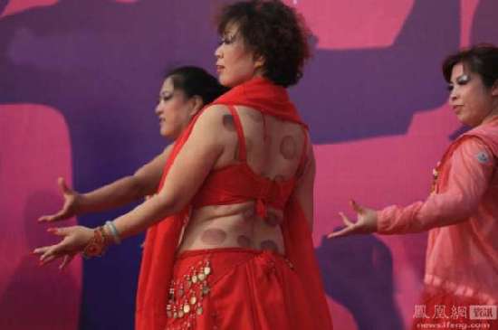 大妈们参加演出,一位大妈背后的火罐印露出。