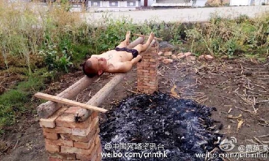 贾槟珲介绍,几天前,他在自家菜地里搭建了木烤杆,找来了玉米干柴、红豆杉木屑,把火烧起来之后,就半裸着躺在木烤杆上让火烤。这种办法可以让42℃的高温持续半个多小时,他烤一会儿就下来烧一会儿火。