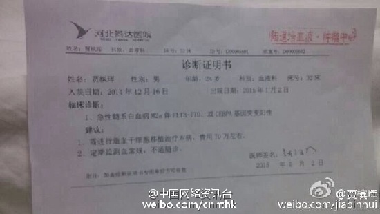 贾槟珲说,白血病即血癌,得了这种病要么一直做化疗,要么做骨髓移植,但无论是哪一种,都需要巨额费用。“手术费50多万元,对于有经济能力的人来说,不算什么,但是对像我这种来自贫困山区的人来说,是家庭巨大的灾难。”