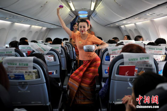 4月13日,一架由太原飞往昆明的航班上,瑞丽航空开展了机上“泼水节”特色服务活动。空姐穿着傣族服饰,跳起傣族舞蹈,向旅客泼水送上祝福。当天正值傣族辞旧迎新的传统节日泼水节。