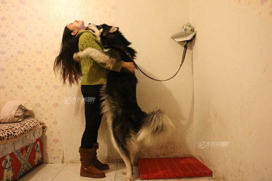 每天下班,她总会先和她的宠物狗玩一会,一年多来,每天坚持遛狗,喂它吃肉,这条阿拉斯加虽然才一岁,却和1米7的她差不多高了。