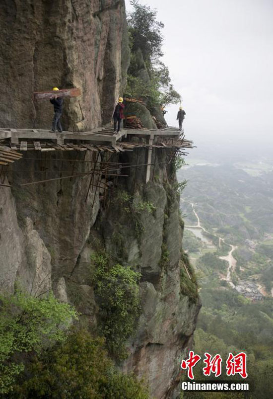 工人们每天的作业时间是清晨6点到下午5点,每个人都有自己的工作任务,日薪300-400元左右。地面作业可以使用大型机械,在悬崖峭壁上修栈道则全部靠人力。栈道工张先国告诉记者,即便是天气晴好,一天最多也只能推进20米。图为几位工人正在施工现场搬运木材。