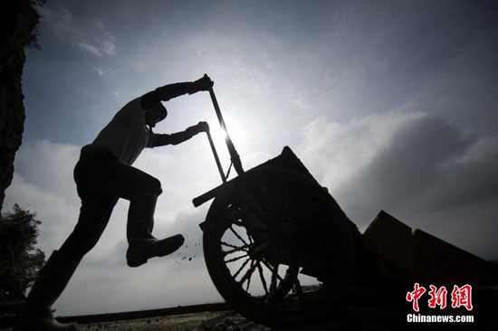 52岁的成竹员是栈道工中年纪最大的。他负责运送水泥和沙石,每次推着近百斤重的沙石行走在悬崖上。休息期间,成竹员告诉记者,他最害怕的就是下雨,下雨栈道不能施工,这样便不会算工钱。