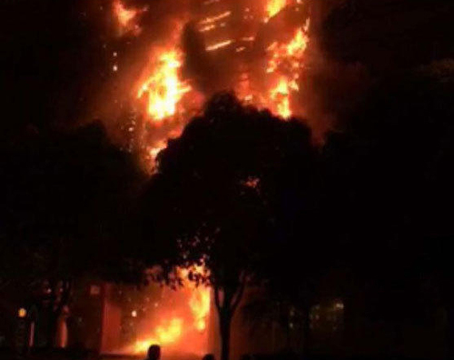 记者22时50分赶到现场看到,起火的桑拿中心名为“太平洋休闲超市”,目前大火已经被扑灭。因为起火地点处于闹市黄金区,现场有不少路人在围观,起火大楼外墙可见15层左右的楼已被熏黑一片。图为火势冲天,2个消防中队5辆消防车赶来扑救。