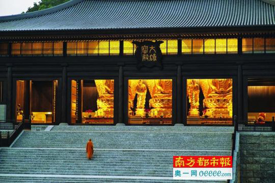 大雄宝殿以佛光寺东大殿为蓝本,并参考奈良唐招提寺金堂比例。何培斌介绍,唐代大殿柱梁用的是红色,为保存清净感觉,改为紫檀原木颜色,殿里供奉释迦牟尼佛、药师佛和阿弥陀佛,佛像后屏障处刻印了源自敦煌莫高窟的壁画,下则陈列着国学大师饶宗颐亲书《心经》卷轴。