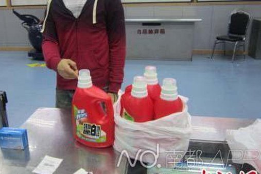 3月25日晚,一名年轻香港旅客深圳过关引起了注意,他背着一个小背包,手上拎着的购物袋却装了4大瓶洗衣液,显得很吃力。旅客称是从香港买来送给内地亲戚的,还煞有介事地拿出了购物小票。但是经查看,发现这4瓶洗衣液封口都很不自然,不像是全新品那样伏贴,应该都是开封后又重新封上的,重量也明显比标示的3升重。打开后,发现“洗衣液”呈黄绿色水状,非常稀薄,加水后也不能产生任何的泡沫。经过现场毒品试纸的检验,呈阳性反应。经鉴定,居然是“止咳水”。图为16公斤止咳水伪装洗衣液。