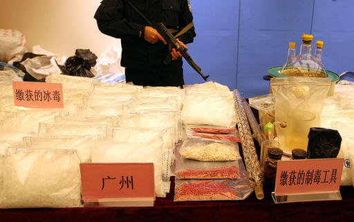 广东开平籍毒贩梁某文可能是史上“最拼”的毒贩,车祸导致颈椎骨折,他躺在病床上,仍用手机遥控指挥贩毒网络,大肆贩毒,百万元的毒资直接用纸箱包装送到病房内。警方4月14日公布此案,目前,该系列案共抓获涉案犯罪嫌疑人19人。图为4月14日,广东省公安厅举办“3+2”专项打击整治行动发布会,展示缴获的毒品和制毒工具。