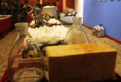 “他住院期间,不断有同伙到医院去探望,要么来联系货源,要么是来送钱的。”警方表示,通过侦查发现,梁某文在医院收到三次现金,每次都有十几万元,直接用纸箱装着现金搬到病房。侦查民警表示,梁某文非常大胆,虽然住在三人间的病房,仍用手机与上线、下线联系,指挥贩毒网络,毫不避讳。梁某文病情稍有好转,竟放弃手术后的住院康复治疗,穿着好似盔甲的护具,坐着轮椅,迫不及待办理了出院手续,住进了酒店,密谋新一轮的毒品贩卖活动。图为广东省公安厅“3+2”专项打击整治行动发布会现场展示缴获的毒品和制毒工具。