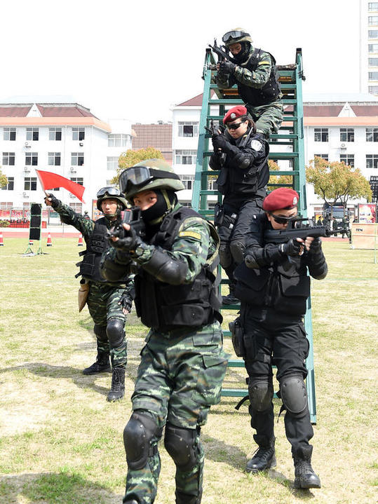 来自武警上海总队九支队特战大队与市公安特警总队百余名反恐特战队员参加演练,女子特警队员首次参加联合演练。图为武警与女特警正在进行突击演练。