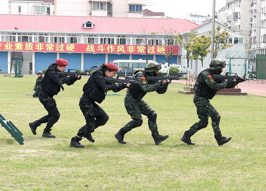训练有素的特战队员先后进行了绕行战术射击、限制条件射击、暴恐识别射击、“7”型靶移动射击、街区搜索射击、房间突入战术射击、一招制敌应用、“三能合一”练习、小组攀登战术等9个实战化训练课目演练。图为武警与女特警正在进行突击演练。