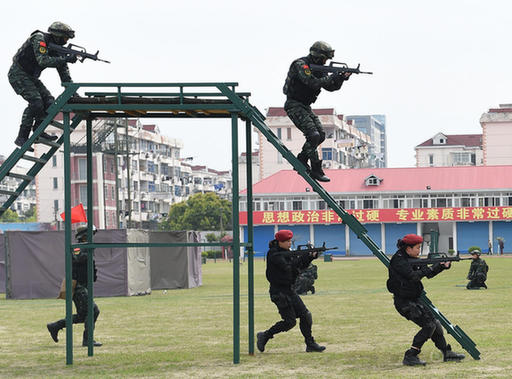 公安武警联合演练检验了武警与公安协同作战、快速反应和灵活处置能力,有效提高了上海市处置恐怖袭击和重大突发事件的能力水平。图为武警与女特警正在进行突击演练。