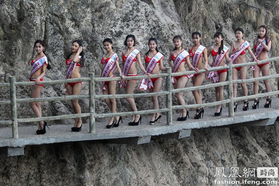 比基尼小姐千米悬空栈道高跟鞋练习走猫步