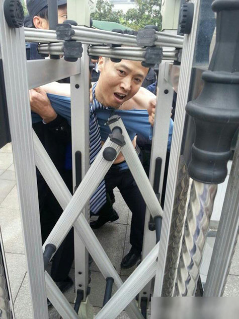 衡阳中院新闻发言人张远毅,21日上午接受记者采访时称:“可能是(案件)受害人家属所为,目前衡阳市公安局已经介入调查。”衡阳中级法院随后发布消息称:当天庭审休庭。图为一名律师上衣被人扒光。