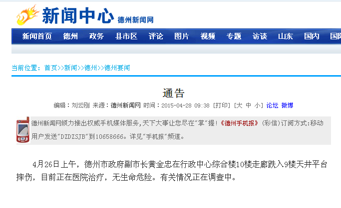 4月26日上午,德州市政府副市长黄金忠在行政中心综合楼10楼走廊跌入9楼天井平台摔伤,目前正在医院治疗,无生命危险。有关情况正在调查中。