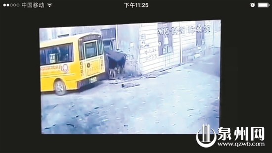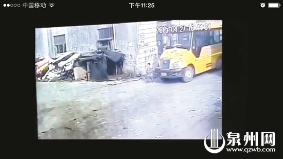 事故发生在菜市场附近的一幢民房拐角处。监控拍下了整个事发经过。视频画面显示,昨日下午4点44分,一辆标有石狮市英才幼儿园字样的校车行驶到该民房边上停了下来,一名男童走下车,边拍着双手边往车头方向慢走。此时车辆继续行驶,并在民房拐角处向右转。等到车辆行驶到民房另一侧时,画面显示男童已倒地。事故经过前后只有8秒钟。