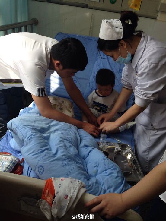 图为在医院,事故中被奶奶护住的孩子正在接受治疗。