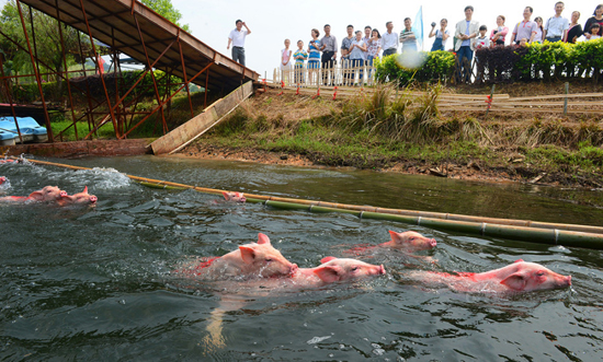 10只经过特别训练粉扑扑憨态可掬的小猪作为竞赛选手,在训练员的带领下由高台跳入水中,你追我赶、争先恐后,游过赛道到达比赛终点。