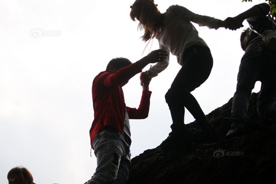 游客冒险爬崖走近道。