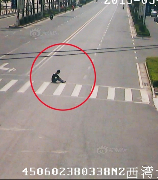 在事故发生前的监控视频显示,碰瓷男子先在十字路口徘徊,时而坐在人行道上,时而在路口来回走动,任其他车辆来往都不避让。