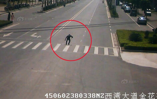 在事故发生前的监控视频显示,碰瓷男子先在十字路口徘徊,时而坐在人行道上,时而在路口来回走动,任其他车辆来往都不避让。