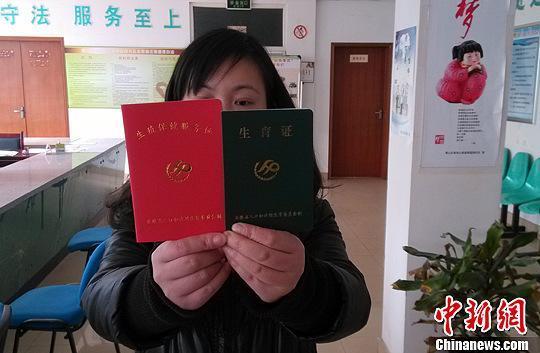 资料图:2月13日,安徽省合肥市计生工作人员展示单独二孩生育证。中新社发 韩苏原 摄