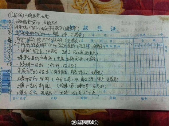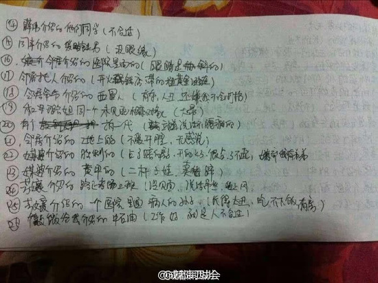 妹儿是个会计,现在24岁,从20岁开始陆续相亲,把相亲对象列了清单,足足有31个海选人!!!用妹纸的话说:“喜欢的太屌丝,想将就又觉得没面子,条件好的没有安全感,条件差的物质上又满足不了…”(新浪四川)