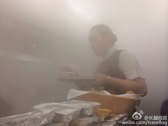 有网友解释称,大雨造成机舱内湿度变大,空调吹出的冷空气遇到湿度大的空气时,空气内的水分遇冷凝结形成雾气,属于正常现象。