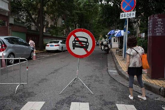 昨日(6月7日)下午,广州市培正中学。为免汽车噪音影响考生,交警在附近的路段设置了路障禁止机动车进入考场范围,一位市民在路障前探头张望。