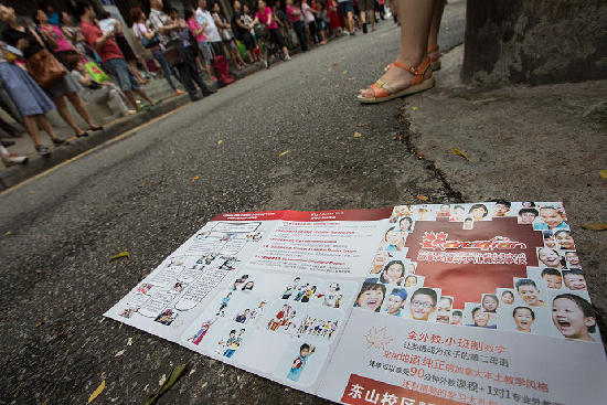 昨日(6月7日)下午,广州市培正中学。考场外等候的考生家长同时也成为了留学中介商家的目标,商家在门外向考生家长们发放的宣传单张被随手扔在地上。